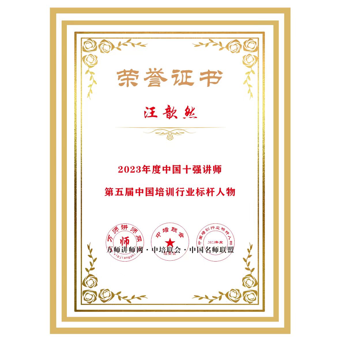 恭喜汪歆然老師榮獲萬師講師網(wǎng)2023年度中國十強(qiáng)講師 暨第五屆中國培訓(xùn)行業(yè)標(biāo)桿人物