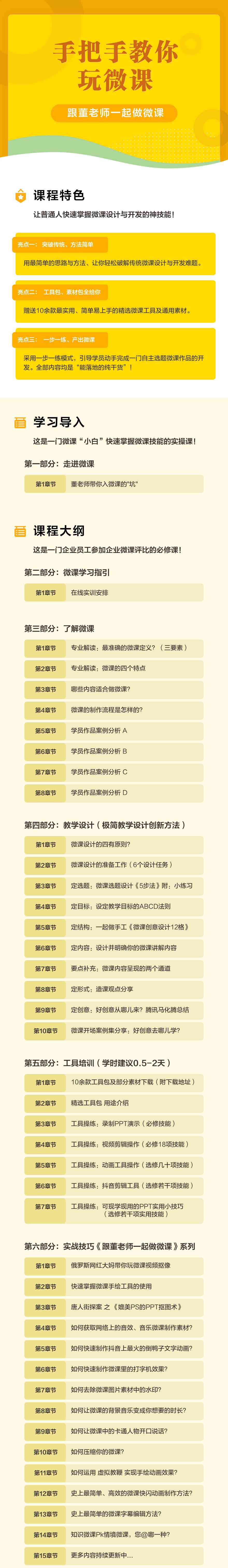 ·這是一門:能讓普通人快速掌握微課設計與開發技能的經驗分享課! ·這是一門:能讓微課“小白”快速掌握微課技能的實操課! ·這是一門:企業員工報名參加單位微課評比活動的必修課! ·課程采用:一步一練模式,案例引導學員動手完成一門自主選題微·課作品的開發。 ·全部內容:均是“經得起實戰檢驗“、“能落地的純干貨”! ·授課講師:觀點犀利,實操實戰,誠意滿滿! ·贈送福利:精選10余款微課制作工具和素材全部給到你!